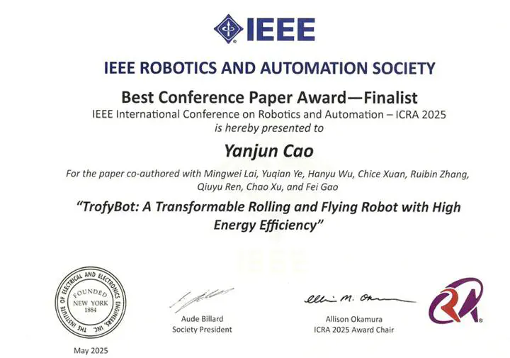 Congratulations to Mingwei Lai and Yuqian Ye for winning the Best Paper Award Finalist at 2025 IEEE International Conference on Robotics and Automation for their novel design of “TrofyBot”.