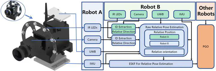 Mutual localization plays a crucial role in multi-robot cooperation. CREPES, a novel system that focuses on six degrees of freedom (DOF) relative pose estimation for multi-robot systems, is proposed in this paper. CREPES has a compact hardware design using active infrared (IR) LEDs, an IR fish-eye camera, an ultra-wideband (UWB) module and an inertial measurement unit (IMU). By leveraging IR light communication, the system solves data association between visual detection and UWB ranging. Ranging measurements from the UWB and directional information from the camera offer relative 3-DOF position estimation. Combining the mutual relative position with neighbors and the gravity constraints provided by IMUs, we can estimate the 6-DOF relative pose from a single frame of sensor measurements. In addition, we design an estimator based on the error-state Kalman filter (ESKF) to enhance system accuracy and robustness. When multiple neighbors are available, a Pose Graph Optimization (PGO) algorithm is applied to further improve system accuracy. We conduct enormous experiments to demonstrate CREPES’ accuracy between robot pairs and a team of robots, as well as performance under challenging conditions.